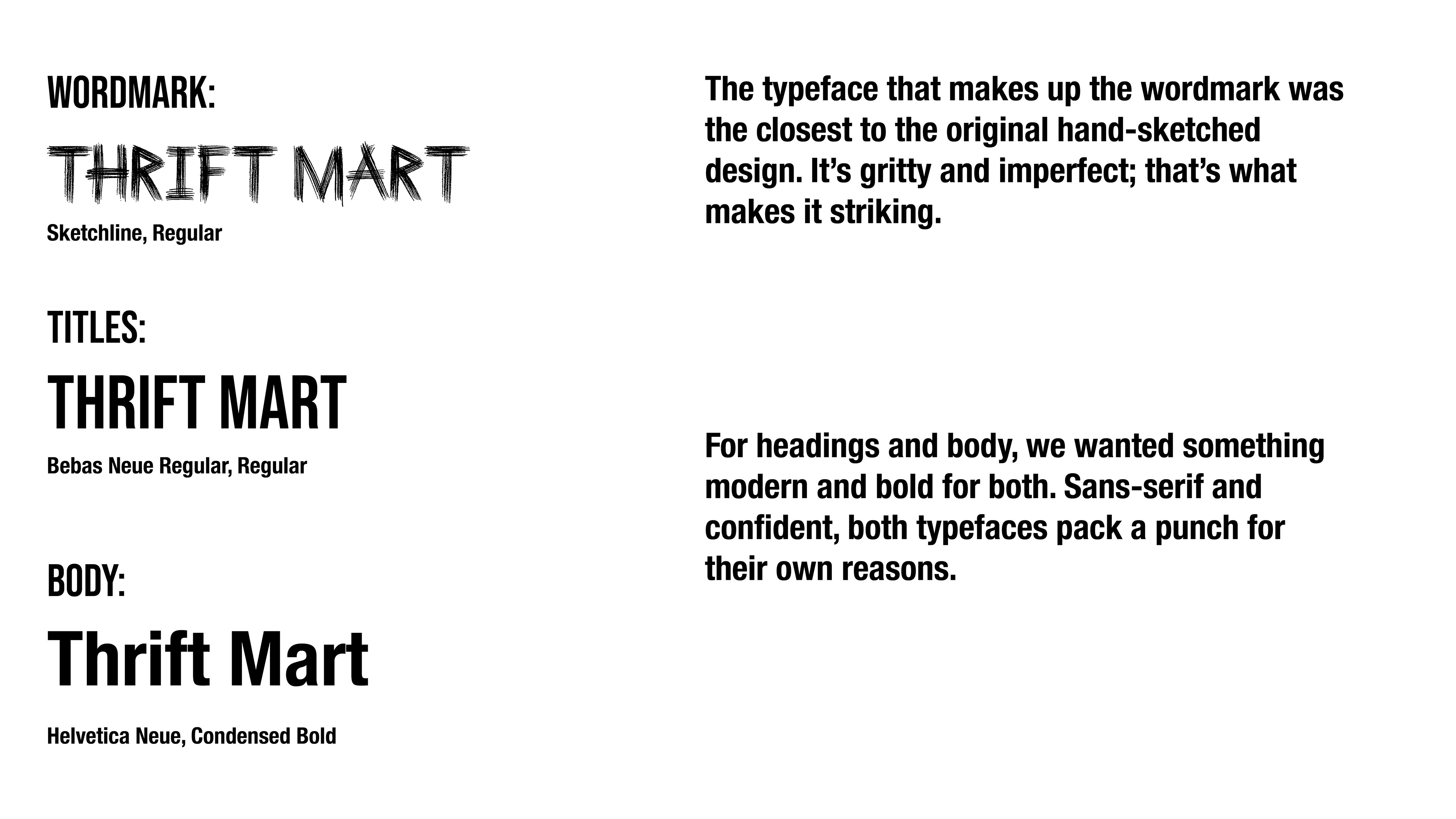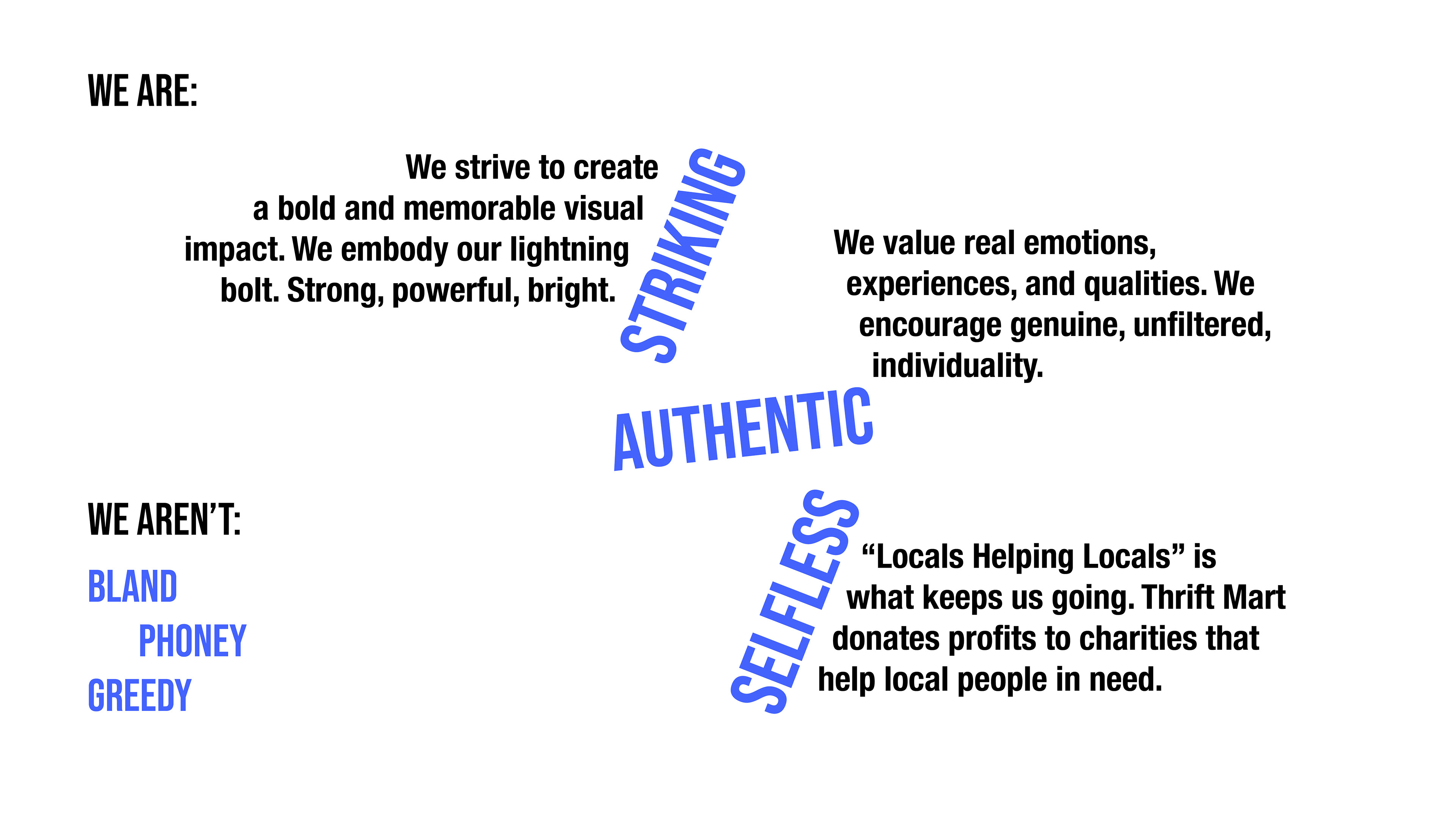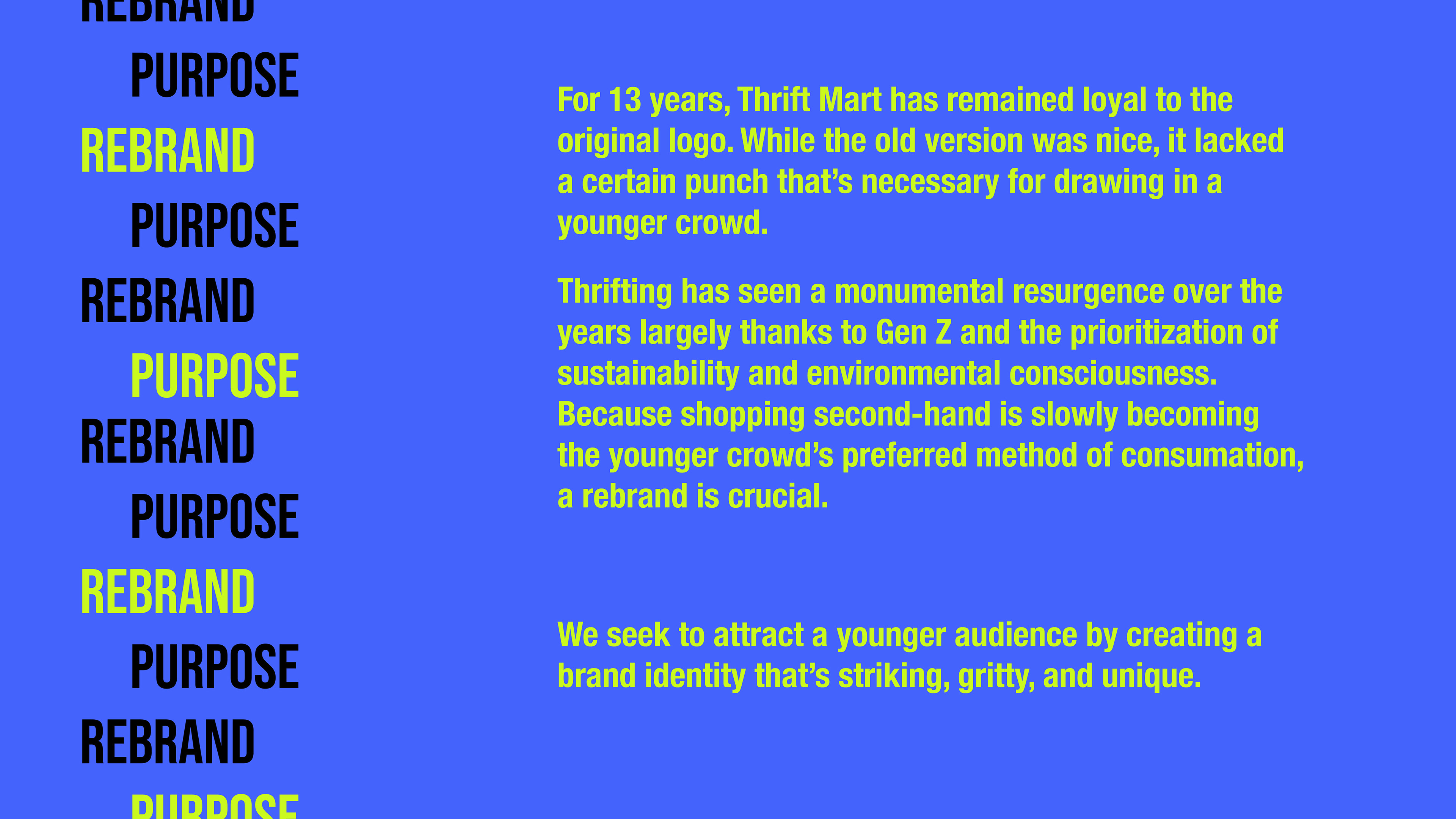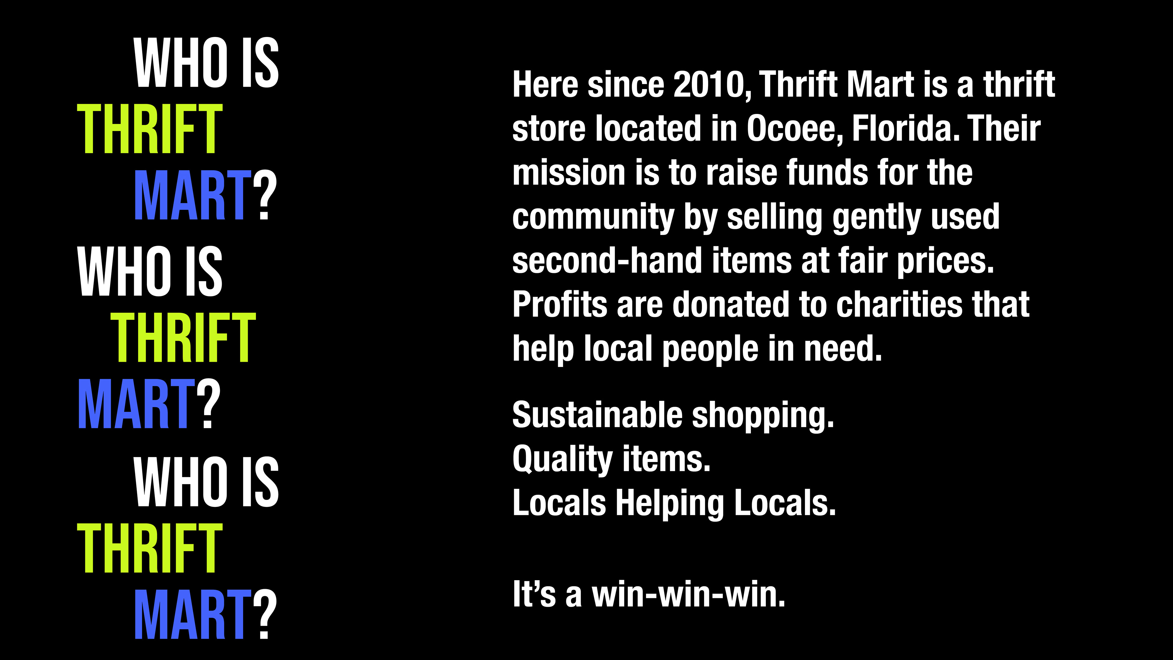 A rebrand proposal for a local thrift mart in Ocoee, FL. Includes an updated logo, brand guidelines, color and typography usage.